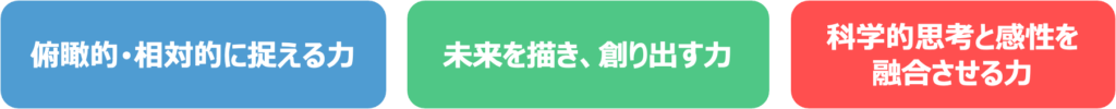 宇宙視点教育では、未来社会を生きる上で不可欠と考える、次の3つの力を育みます。
